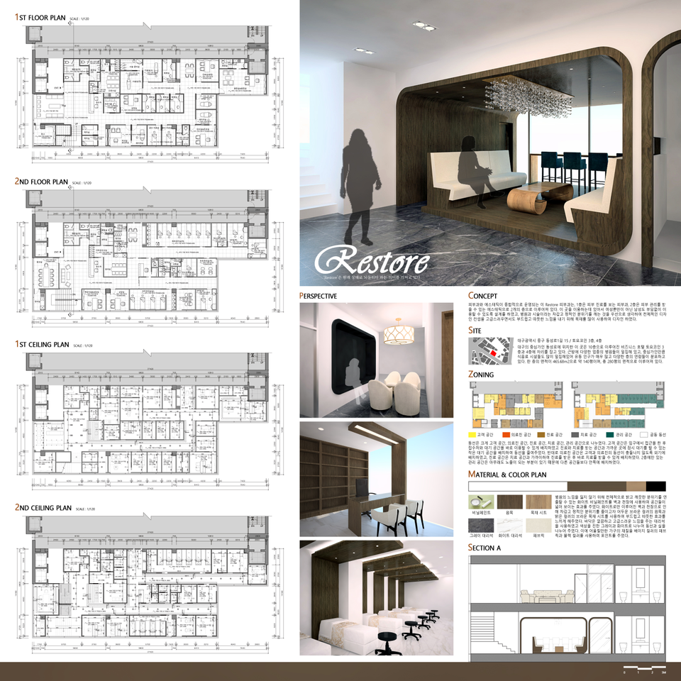 피부과와 에스테틱이 종합적으로 운영되는 이 "Restore" 피부과는 1층은 진료를 보는 피부과, 2층은 피부 관리를 받을 수 있는 에스테틱, 2개층으로 이루어져 있다. 이 곳을 이용하는데 있어서 여성과 함께, 남성도 부담없이 이용할 수 있도록 디자인하였고, 병원과 시술이라는 차갑고 정적인 분위기를 탈피하고자 노력하였다. 전체적인 디자인 컨셉을 고급스러우면서도 부드럽고 따뜻한 느김을 내기 위해 목재를 많이 사용하여 디자인하였다.