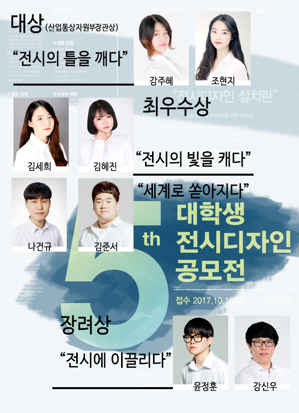 제5회 대학생 전시디자인 공모전에서 실내건축디자인전공 전시그래픽반에서 2년 연속 대상을 수상하는 영광을 누리게 되었습니다. 특히, 올해의 경우 대상부터 최우상, 장려상에 이르기까지 상위순위를 전시그래픽반에 독점하게 되는 큰일 아닌 큰일을 저지르게 되었습니다.